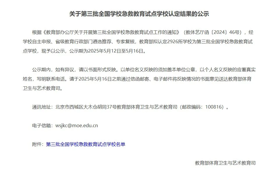 近日,教育部體育衛(wèi)生與藝術(shù)教育司發(fā)布《關(guān)于第三批全國學校急救教育試點學校認定結(jié)果的公示》,全國共有2926所學校入選。