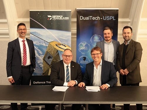 (左起)Defence Trailblazer首席執行官Sanjay Mazumdar、阿德萊德大學副校長兼教授Michael Goodsite、HB11首席執行官Warren McKenzie、HB11 首席技術官Sergey Pikuz和 Dualtech USPL小組負責人 Miftar Ganija教授。照片由阿德萊德大學提供。