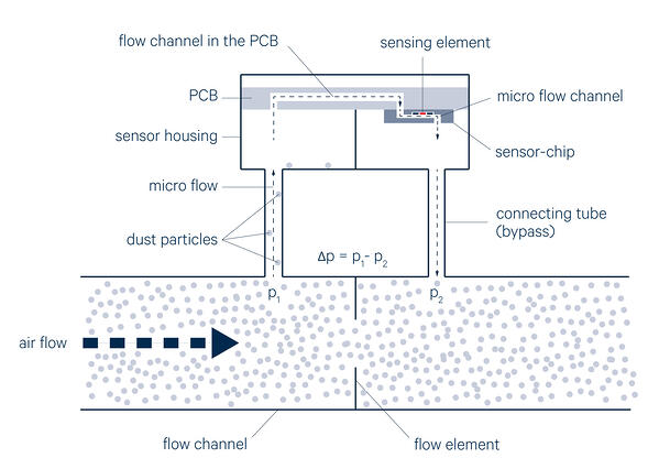 壓差傳感器測(cè)量流量元件(例如孔口或測(cè)量十字)的壓降以確定體積流量。傳感器位于主流的旁路中。